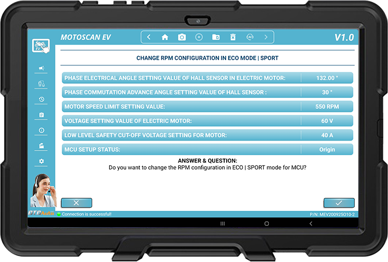 - Configure MCU system: configuration of motor speed (RPM), phase shift angle & phase advance angle of Hall sensor, voltage used by electric motor, setting EBS mode etc.